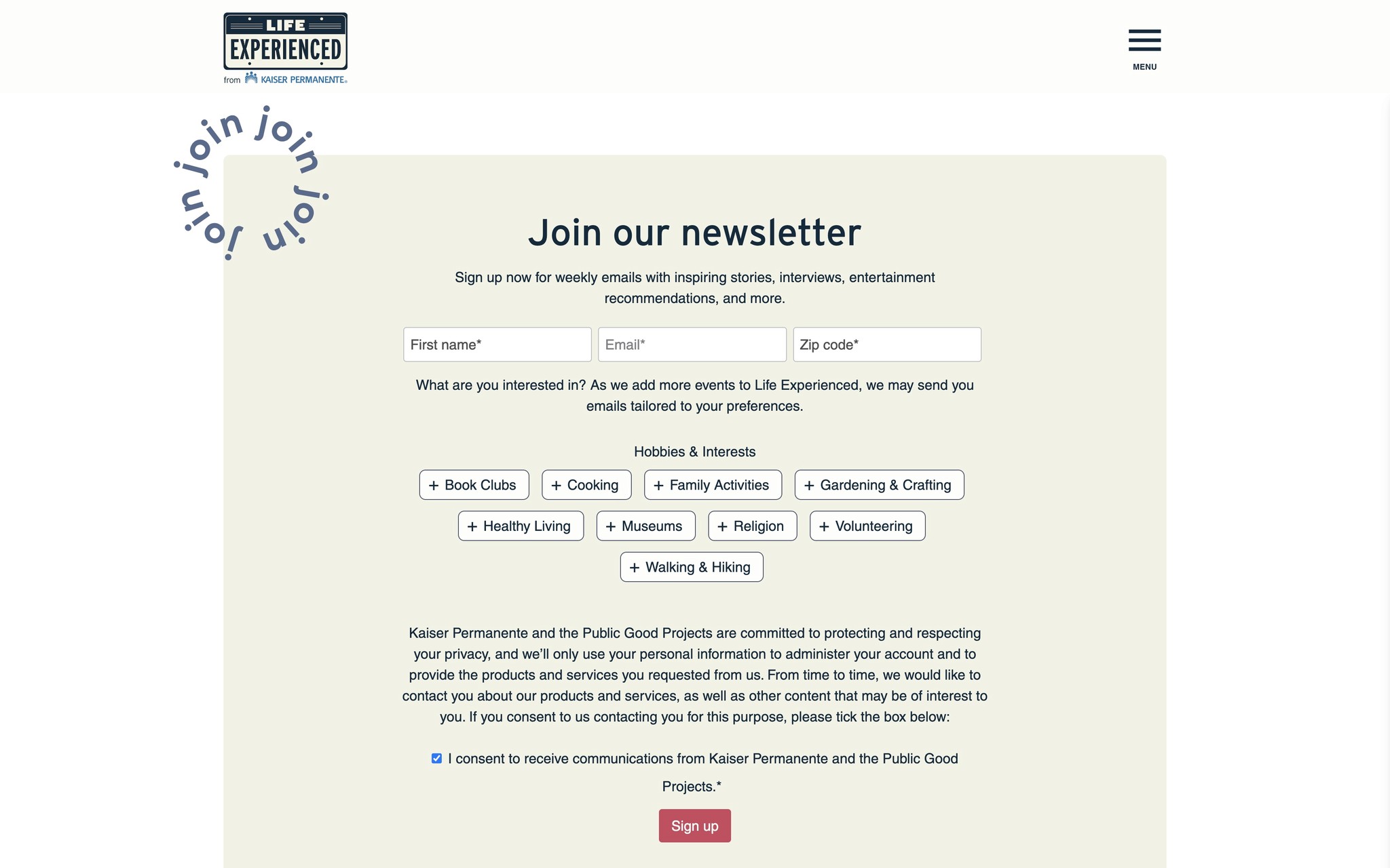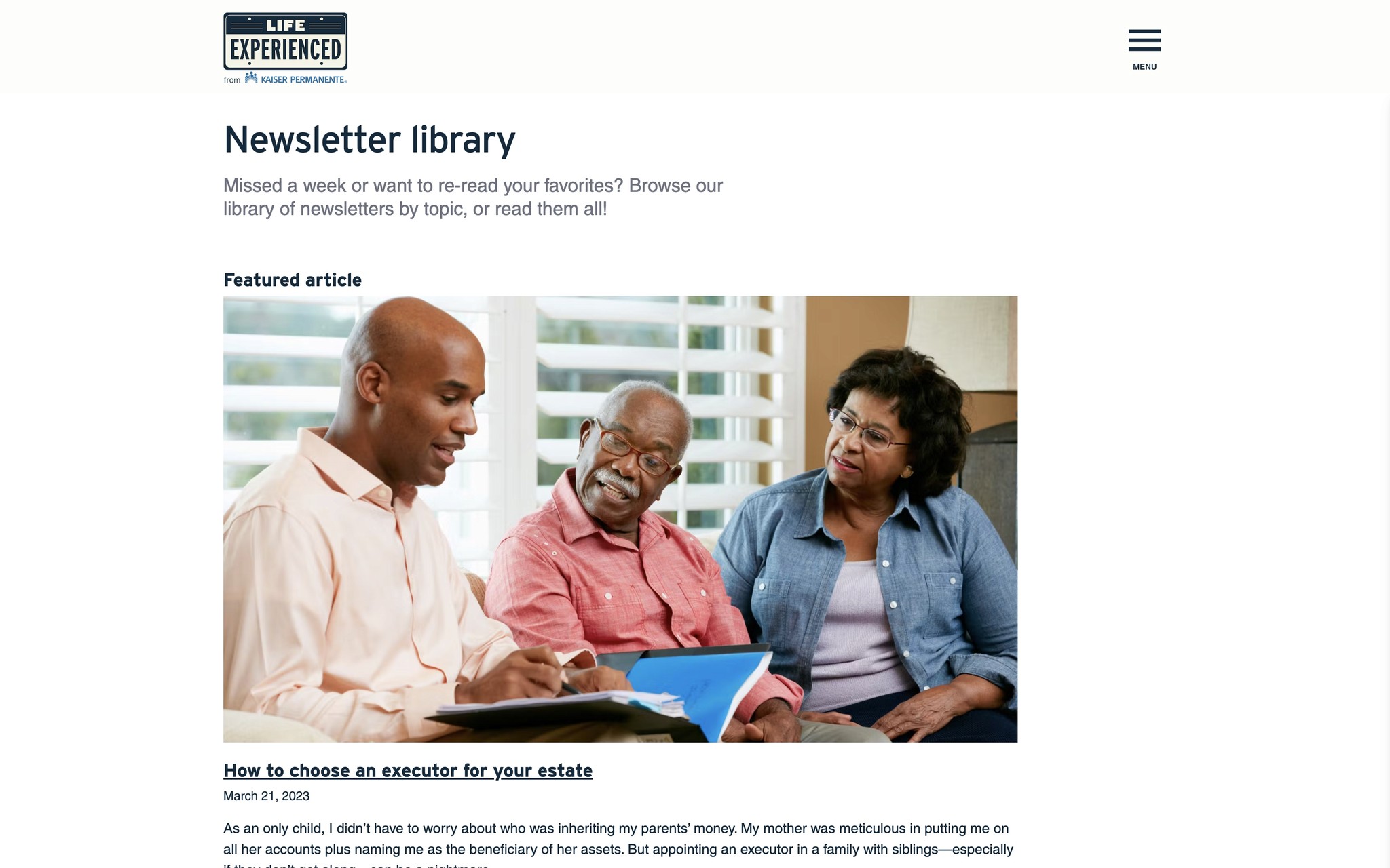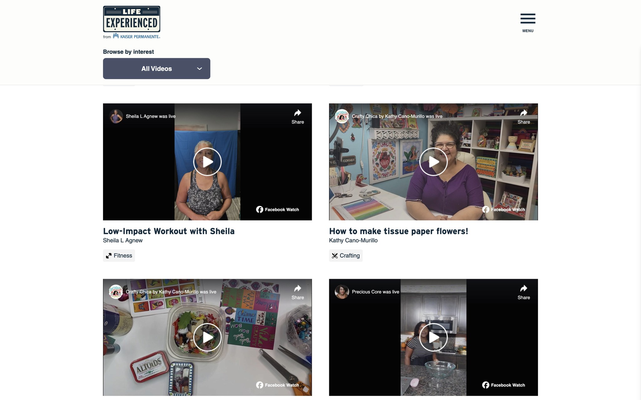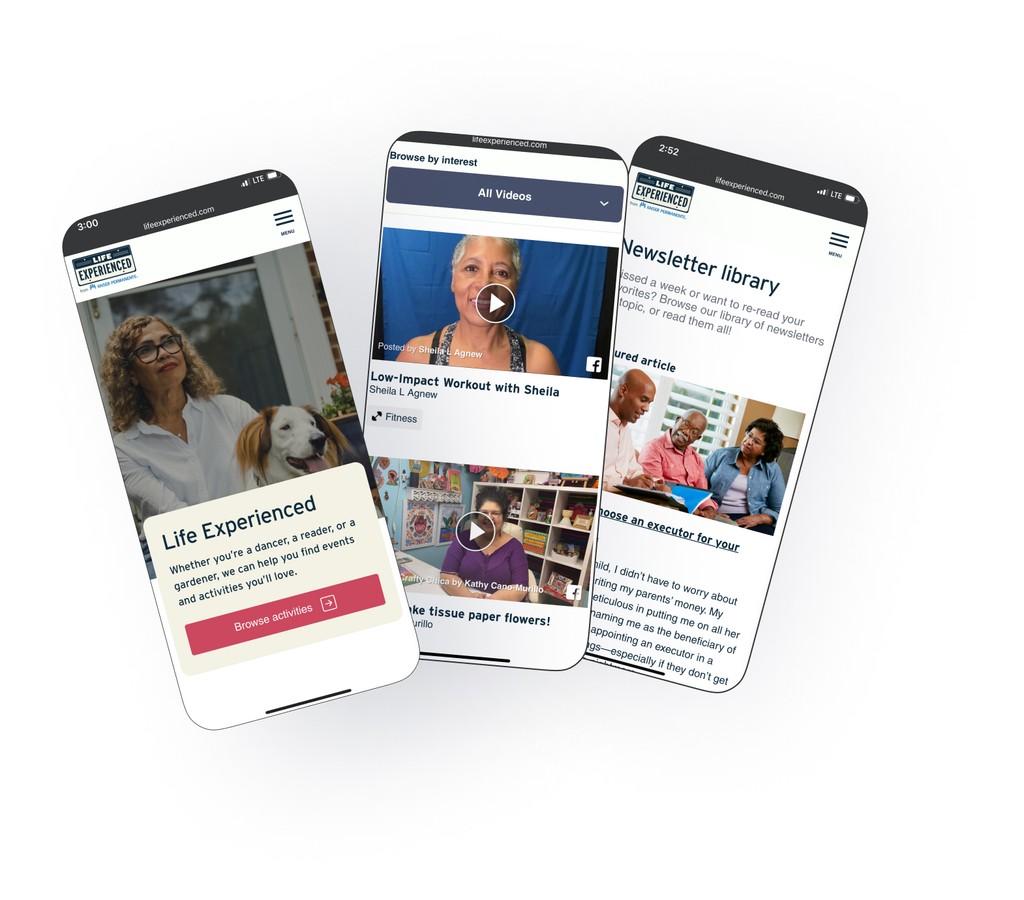 Life Experienced is a place where older adults can go to find virtual and local events, video & newsletter content for people like them.